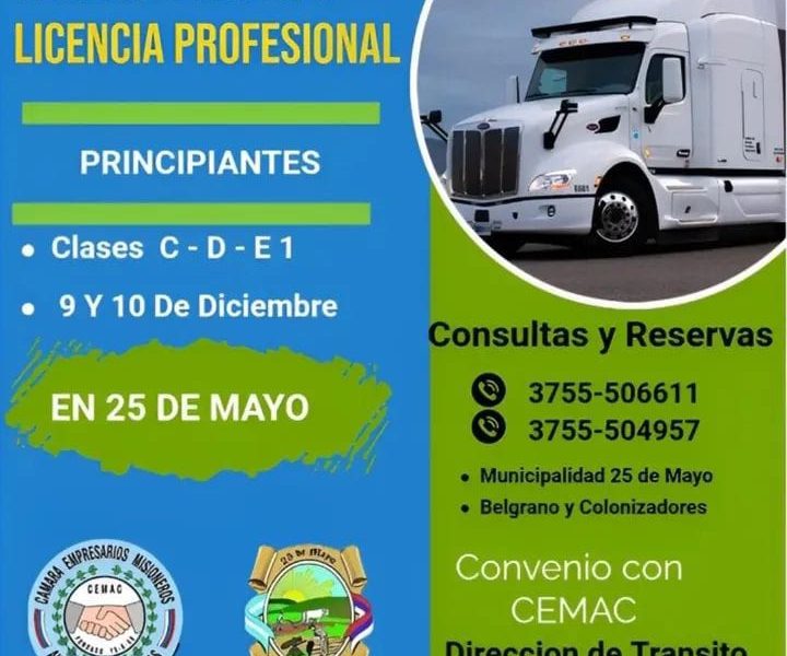 La Municipalidad de 25 de Mayo, en articulación con la Cámara de Empresarios Misioneros de Autotransporte de Cargas (CEMAC), anunció la realización de un curso teórico-práctico destinado a quienes deseen iniciar el trámite de la licencia profesional de conducir en las categorías C, D y E1.