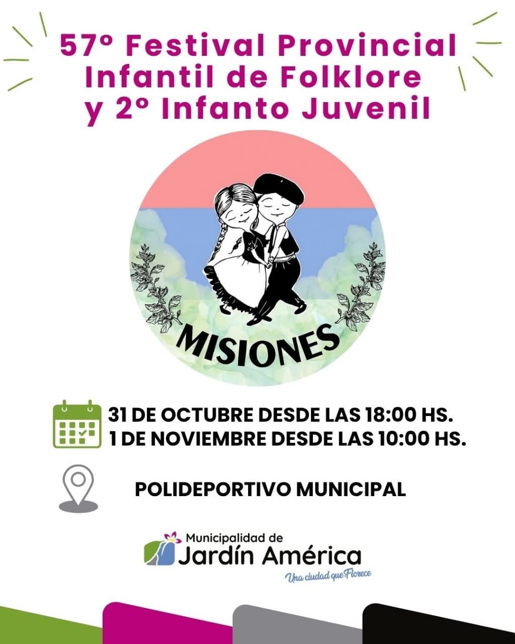 El Festival Infanto Juvenil de Folklore de Jardín América vivirá una nueva edición este 31 de octubre, desde las 18 hs, y el 1° de noviembre, desde las 10 hs.
