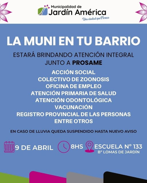 El jueves 9 de abril, “La Muni en tu Barrio”, junto al PROSAME, estarán en la Escuela N°133 del Barrio Lomas de Jardín a partir de las 8 hs, acercando servicios y atención a los vecinos de la zona.