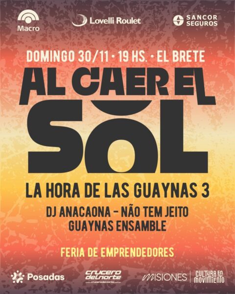 Mujeres y disidencias toman el atardecer con música, arte y comunidad. Al Caer el Sol se presentan DJ Anacaona, Não Tem Jeito y Guaynas Ensamble. Durante el evento se recibirán donaciones y aportes voluntarios destinados a la #RedCocinerasComunitariasMisiones, que acompaña a familias de distintos barrios.