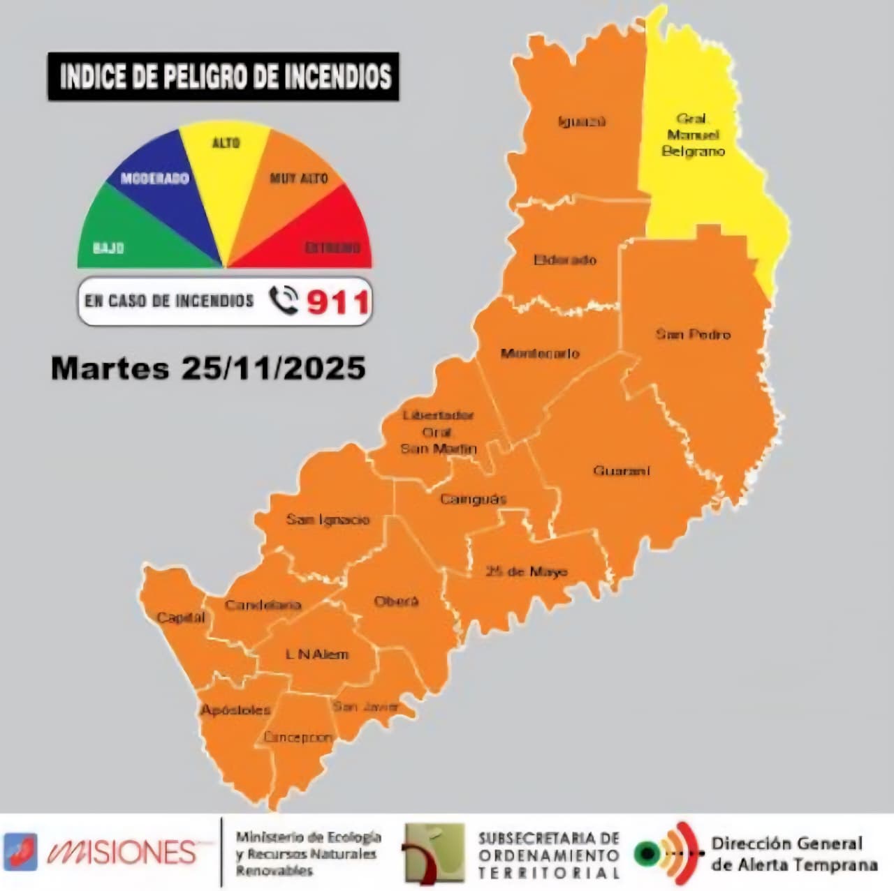 El estado provincial a través del ministerio de ecología elevó el riesgo de incendios a “muy alto”, con un mapa provincial completamente en naranja, qué puede inclusive tornarse rojo en los próximos meses.