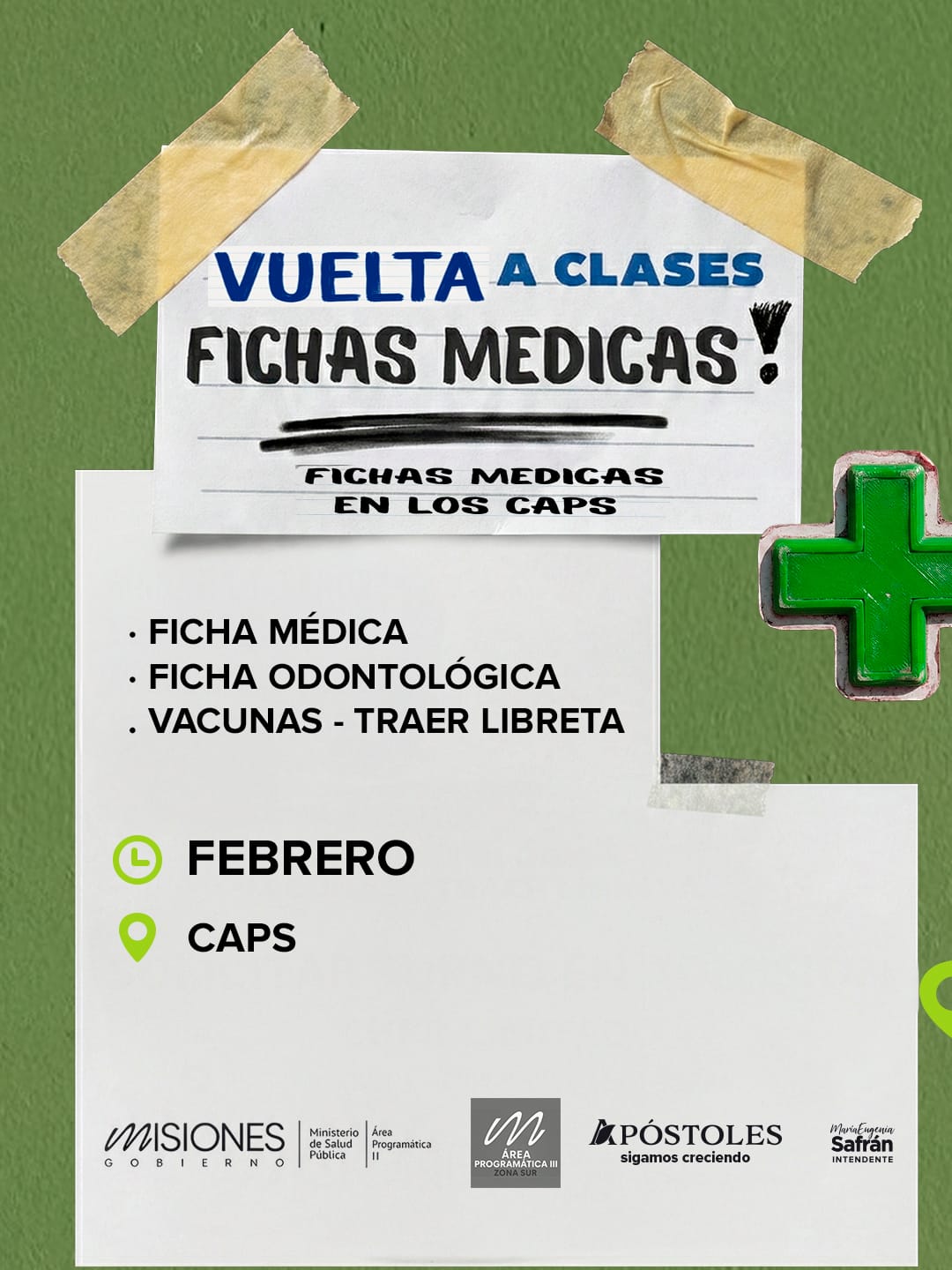 El operativo de fichas médicas escolares se llevará a cabo en distintos CAPS de Apóstoles durante febrero, impulsado por la Municipalidad junto al Ministerio de Salud Pública de Misiones, a través del Área Programática III de zona sur. La iniciativa busca garantizar controles médicos, odontológicos y de vacunación, con cupos limitados y fechas específicas en cada centro de atención.