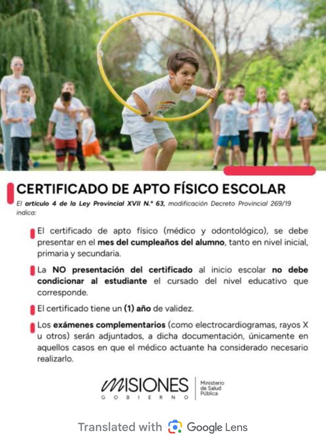 Asimismo, aclaró que “por ahí la gente queda un poquito exaltada porque si no se le hace el electro la maestra no quiere que el alumno realice educación física. Tenemos un decreto, el 2167/12, que señala que todos los estudios complementarios tienen un tiempo estimativo que es de un año”.