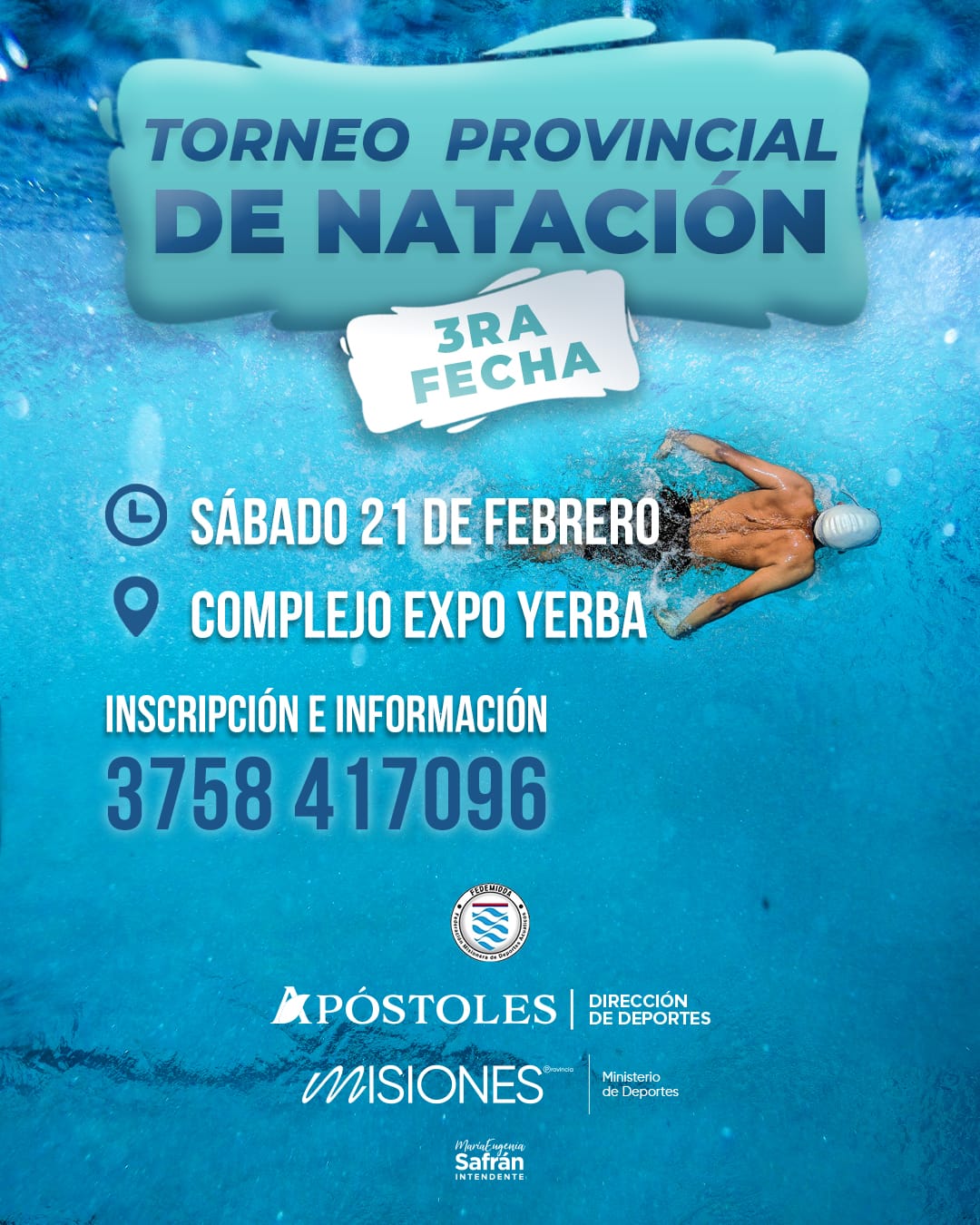 El próximo sábado 21 de febrero, la ciudad de Apóstoles será escenario de la tercera fecha del Torneo Provincial de Natación, una competencia que se viene desarrollando año tras año en la provincia de Misiones y que reúne a los principales equipos y nadadores del ámbito provincial.