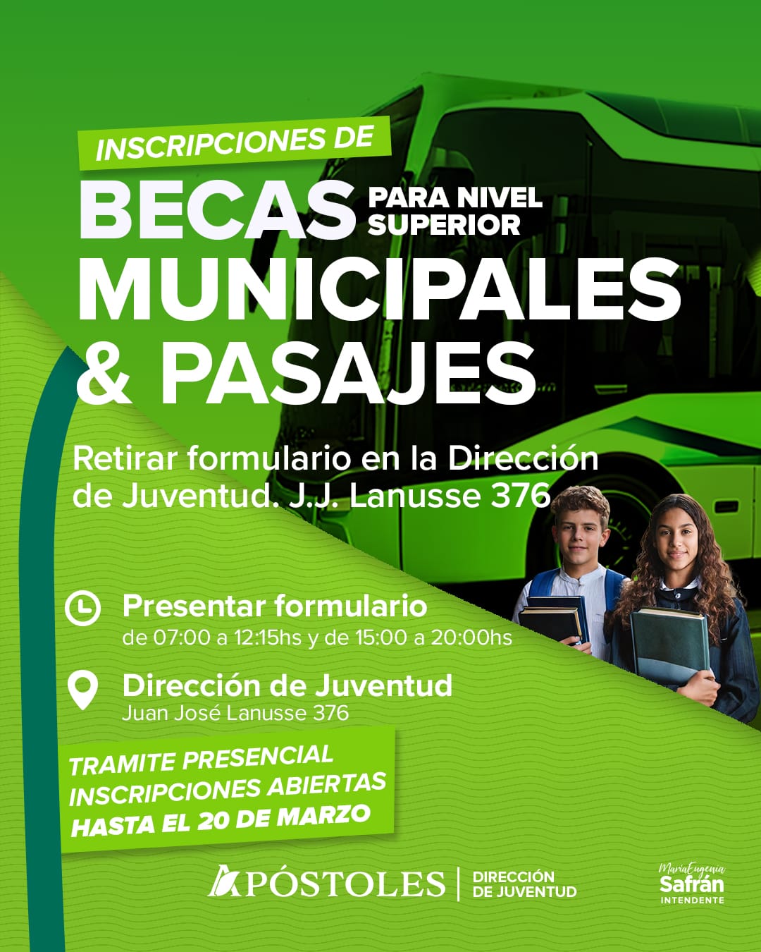 En este momento están nuevamente las inscripciones, para la Beca Municipal , esto muestra el compromiso de la Municipalidad de Apóstoles, y de la Dirección de Juventud de acompañar a los estudiantes con este tipo de beneficios para que puedan continuar o empezar sus estudios. Es una ayuda que se les brinda a todos los chicos que estudien tanto en nuestra Localidad y a aquellos apostoleños que deben trasladarse a otras Localidades a estudiar. Y además está la Beca de Pasajes para los estudiantes que tienen domicilio en Apóstoles y deben viajar a otras Ciudades a estudiar.»