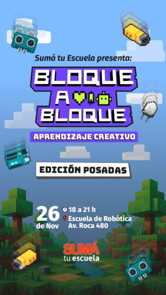 El programa Sumá tu Escuela realizará el cierre de su ciclo lectivo 2025 con el evento “BLOQUE A BLOQUE”, una jornada que reunirá a todas las escuelas que formaron parte del universo del programa durante este año. La actividad se llevará a cabo el miércoles 26 de noviembre, de 18 a 21h, en la sede central de la Escuela de Robótica de Misiones (Av. Roca 480, Posadas).