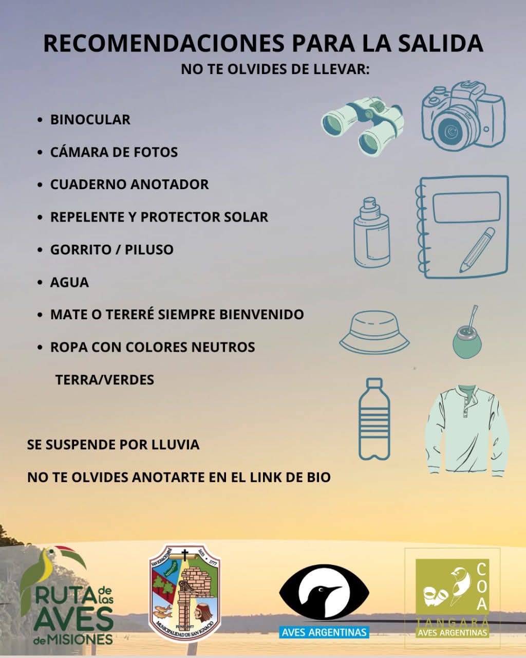 Como recomendación los organizadores detallaron llevar hidratación, vestimenta de colores neutros, calzado cómodo y cerrado para caminatas, repelente de insectos, protector, solar de tener piel sensible, además de binoculares y pequeña guía de observación de aves de Misiones (optativos).