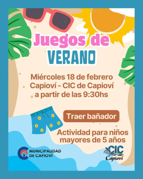La cita será este miércoles 18 de febrero, a partir de las 9:30 horas, en el CIC de Capioví. La actividad está destinada a chicos y chicas mayores de 5 años y busca generar un espacio de encuentro, recreación y comunidad en el marco de la temporada estival.