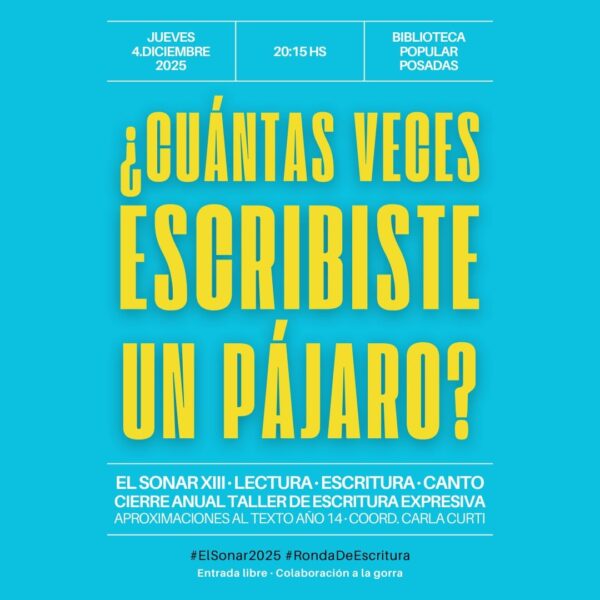EL SONAR XIII es el cierre anual del taller de escritura Aproximaciones al Texto. Una invitación a escuchar lo que trae la ronda, a escribir algo nuevo en clave de ave, a leer juntos un pájaro de palabras nuestras que vuele a nuestro tiempo. Organizan Carla Curti + Ronda de Escritura