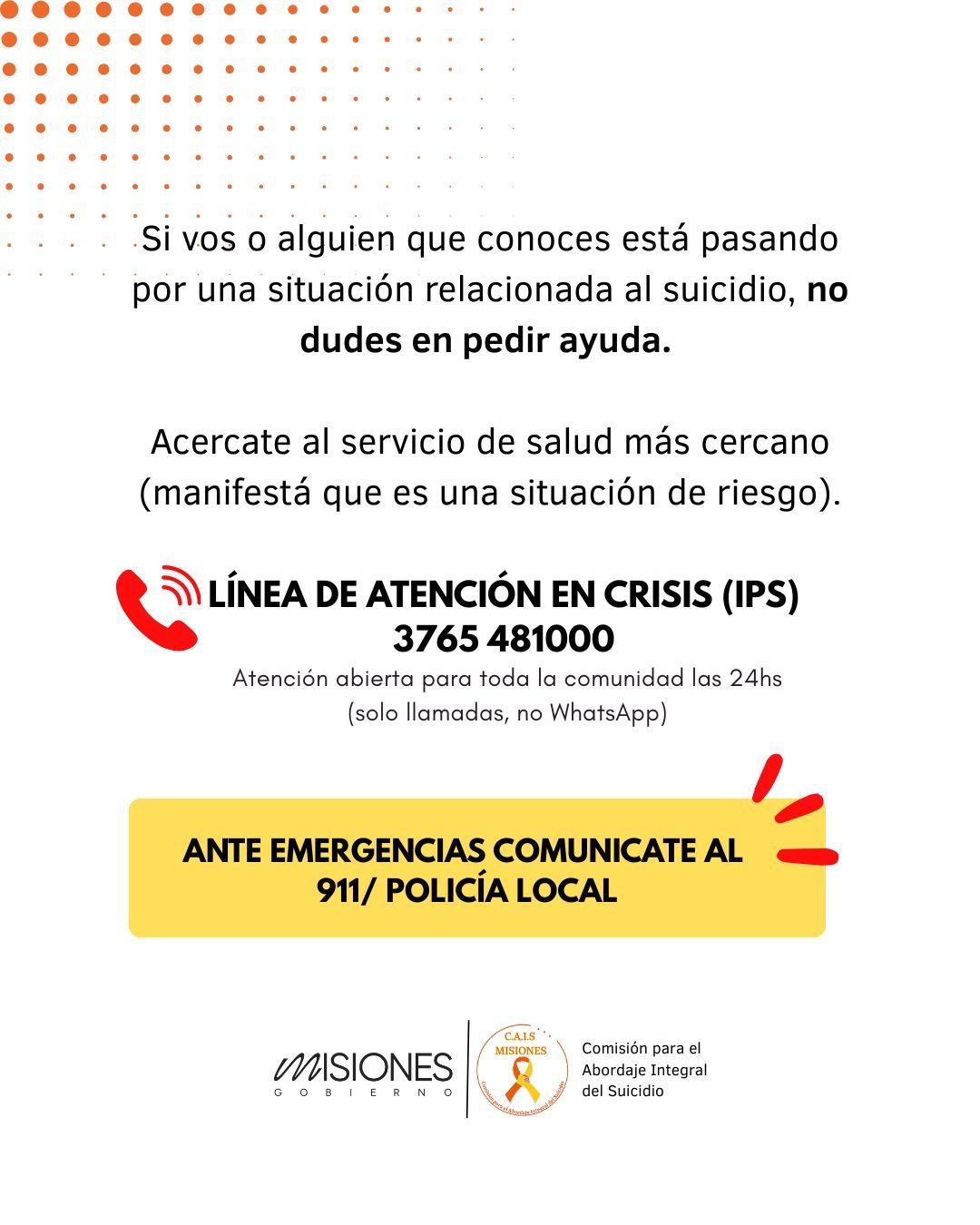 – La Línea en crisis (3765-481000) funciona 24/7 y brinda una escucha especializada en salud mental, orientando a la persona en ese momento de crisis y articulando con el sistema de salud pública para el seguimiento. El 911, en cambio, es un número de emergencias inmediatas, fundamental cuando hay un riesgo inminente para la vida y se requiere intervención urgente en el lugar.