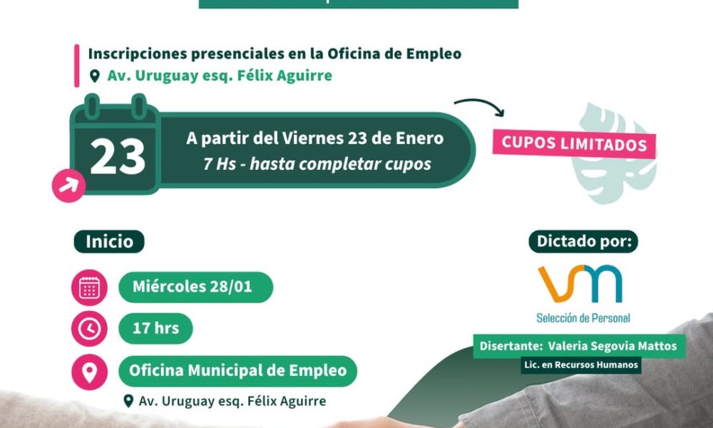 En el marco de las capacitaciones que se dictaron en el transcurso de este mes en la Oficina de Empleo municipal, este miércoles 28 a las 17 h en la sede de la oficina, Av. Uruguay y Felix Aguirre, se ofrecerá el taller de empleabilidad, que estará a cargo de la licenciada en RRHH y especialista en selección de personal, Valeria Segovia Mattos, quien brindó detalles acerca de la charla en Radio Municipal, FM 95.1.