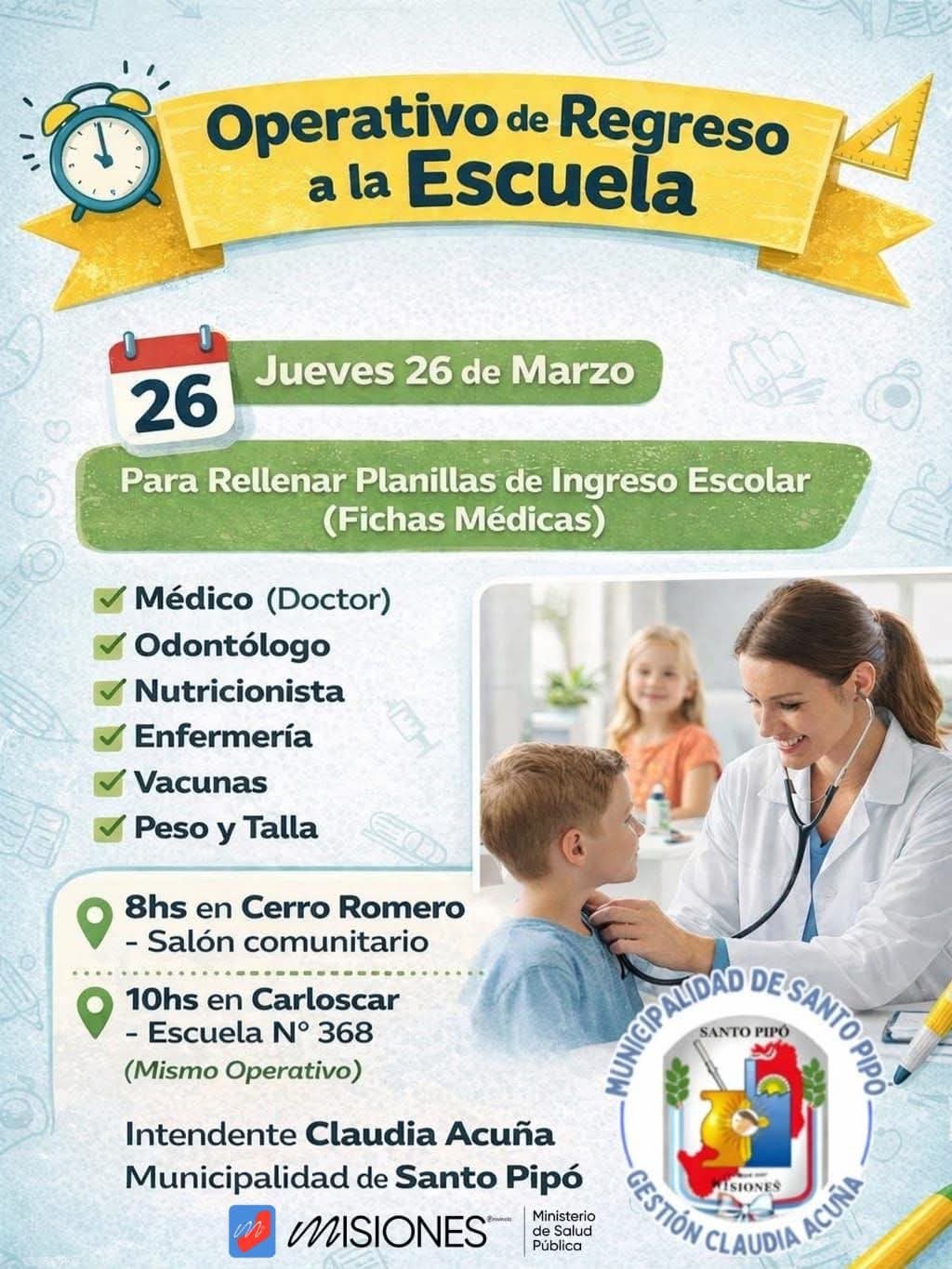 Este jueves 26 de marzo se realizarán 2 importantes operativos denominados «De Regreso a la Escuela», los que están destinados a completar las planillas de ingreso escolar (fichas médicas) de los estudiantes.