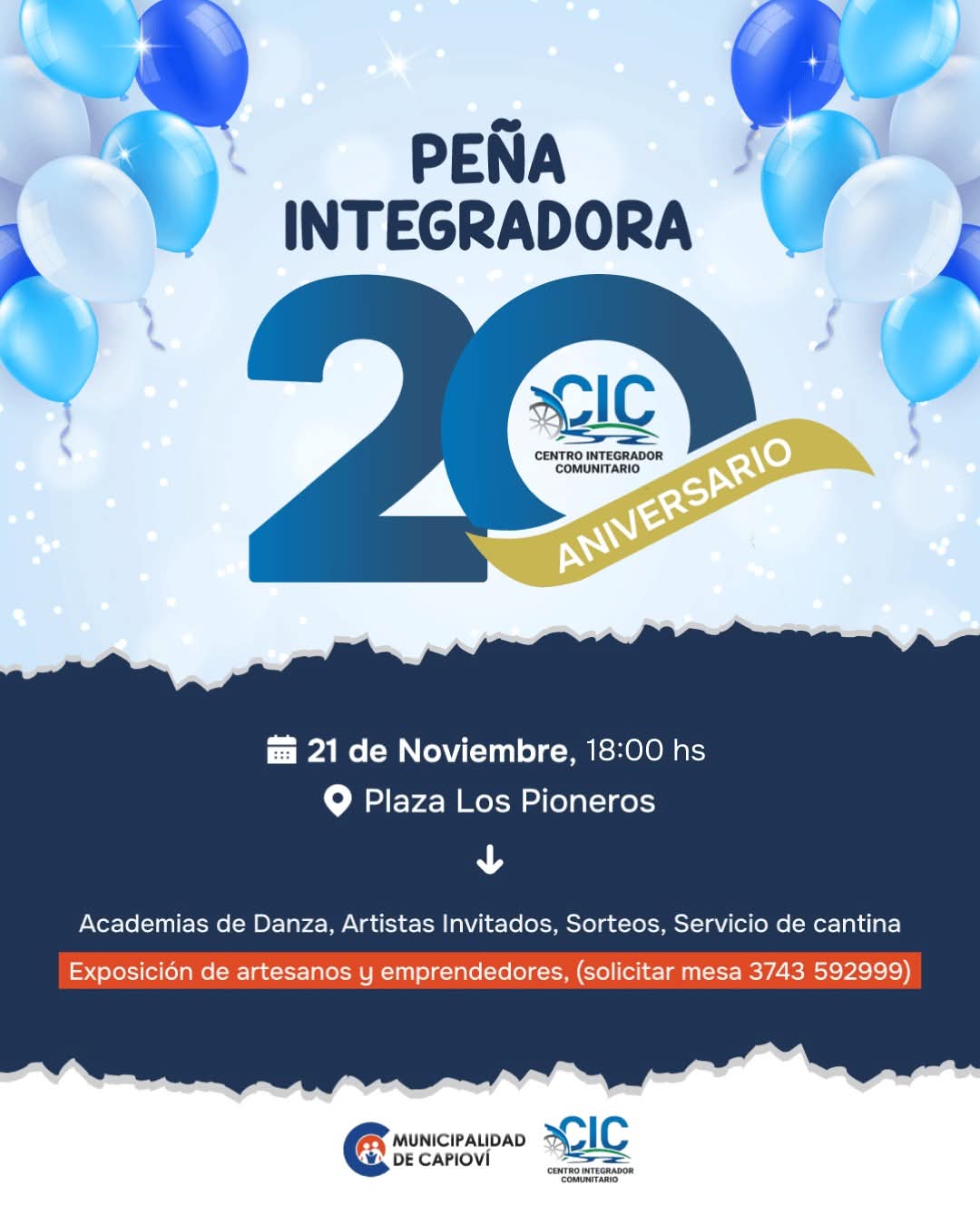 Desde la gestión de Ramón Arrúa en Capioví invitan a festejar los 20 años del CIC local, con una gran Peña Integradora que se realizará el 21 de noviembre a partir de las 18:00 horas en la tradicional Plaza Los Pioneros.