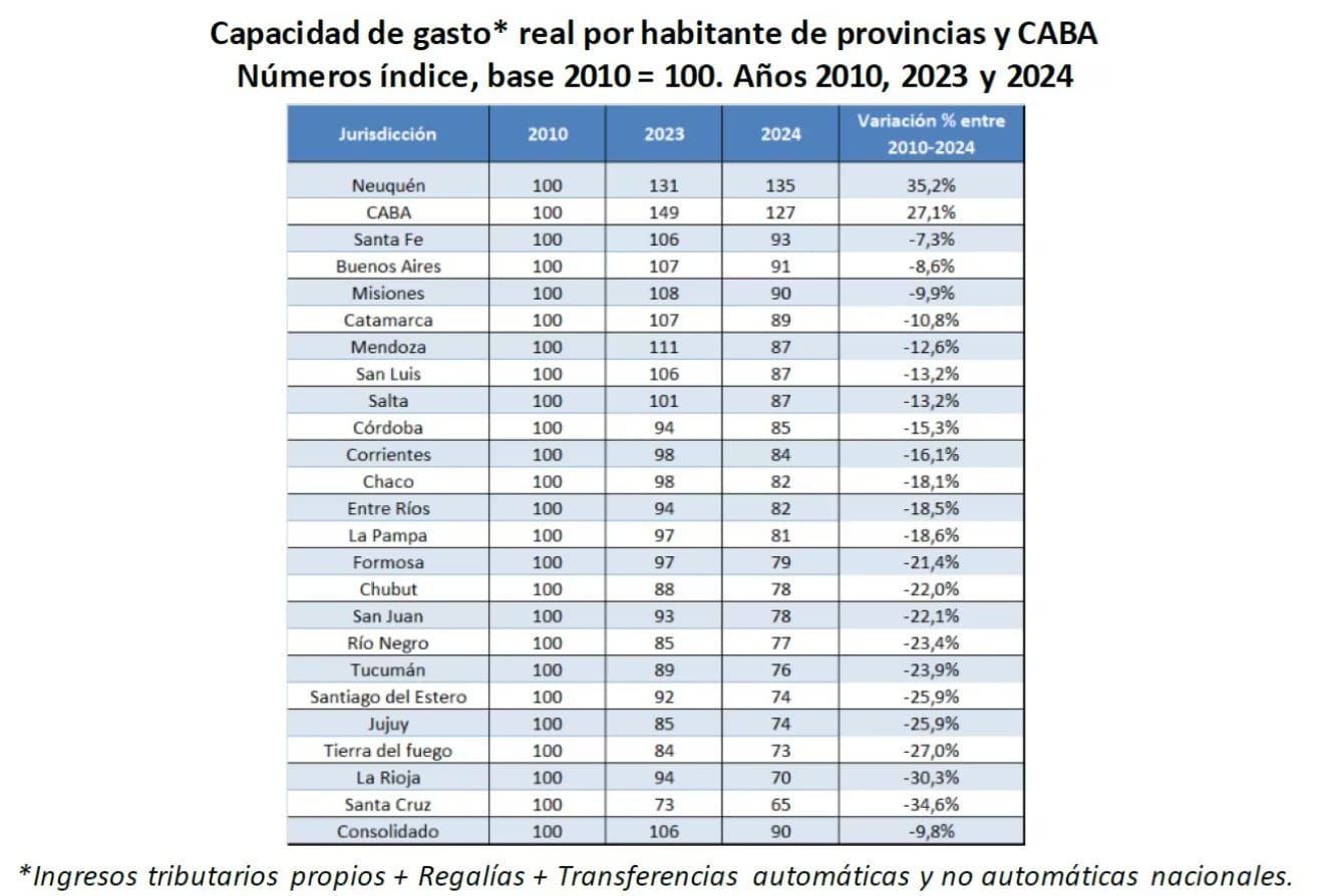 En un reciente informe del Instituto Argentino de Análisis Fiscal (IARAF), de autoría del economista Nadin Argañaraz, analiza en profundidad la distribución de los recursos federales en la Argentina y pone el foco en la capacidad de gasto por habitante derivada de las transferencias automáticas que la Nación envía a las provincias y a la Ciudad Autónoma de Buenos Aires.