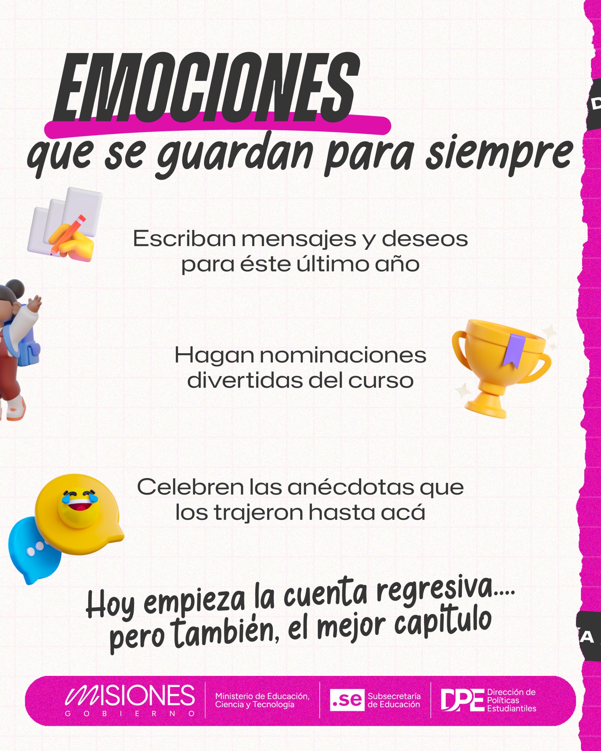 Con la llegada del Último Primer Día (UPD), el Ministerio de Educación, Ciencia y Tecnología refuerza su labor de prevención y concientización para que esta celebración estudiantil se viva con alegría, respeto y bienestar, sin alcohol ni excesos. La propuesta se enmarca en una línea de acompañamiento que pone en el centro el cuidado colectivo y los acuerdos de convivencia.