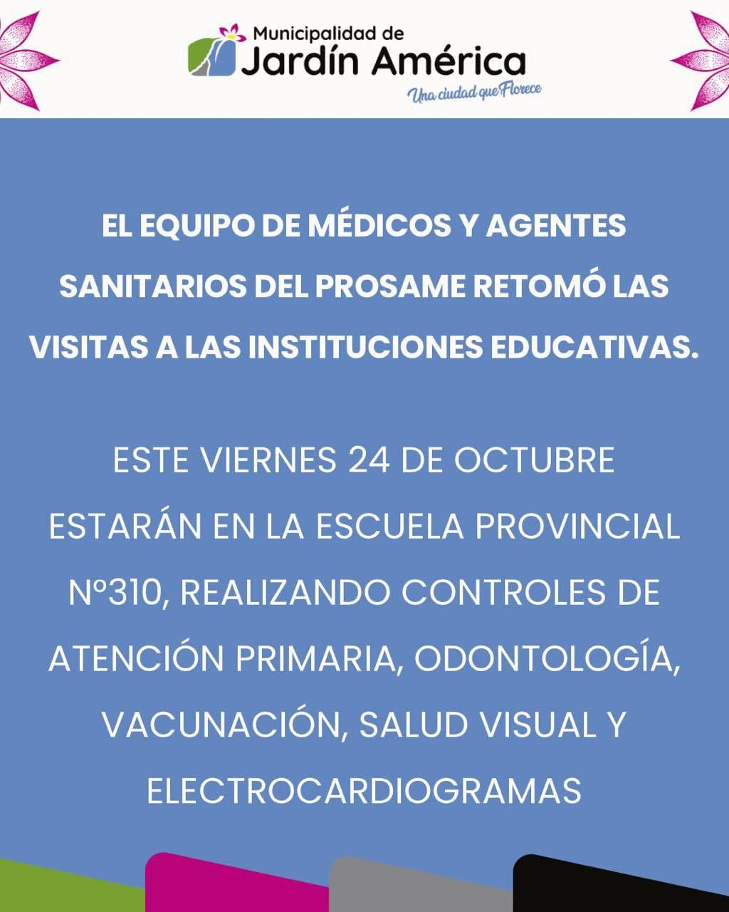 El equipo de profesionales del PROSAME retomó las actividades de atención en instituciones educativas. Así el próximo viernes, 24 de octubre, estarán en la Escuela Provincial N°310, realizando controles de atención primaria, odontológicos, de vacunación, salud visual y electrocardiogramas, en el marco de las acciones de promoción y prevención de la salud.
