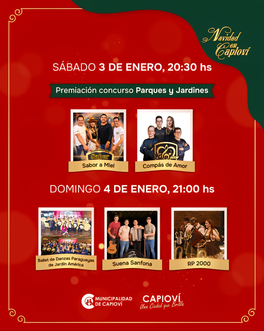 Esta así que el próximo sábado 03 de enero a las 20,30 horas se llevará delante la premiación del concurso Parques y Jardines, seguido de las actuaciones en el escenario padre «José Marks», de la plaza Los Pioneros, de: Sabor a Miel, y