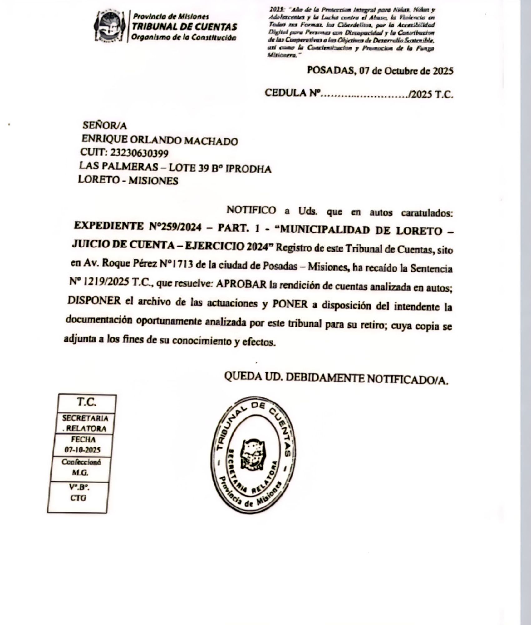 A través de un comunicado oficial dirigido al tesorero de la municipalidad de Loreto, Enrique Orlando Machado, el tribunal de cuentas de la provincia de Misiones comunicó la aprobación del balance integral de gestión año 2024.