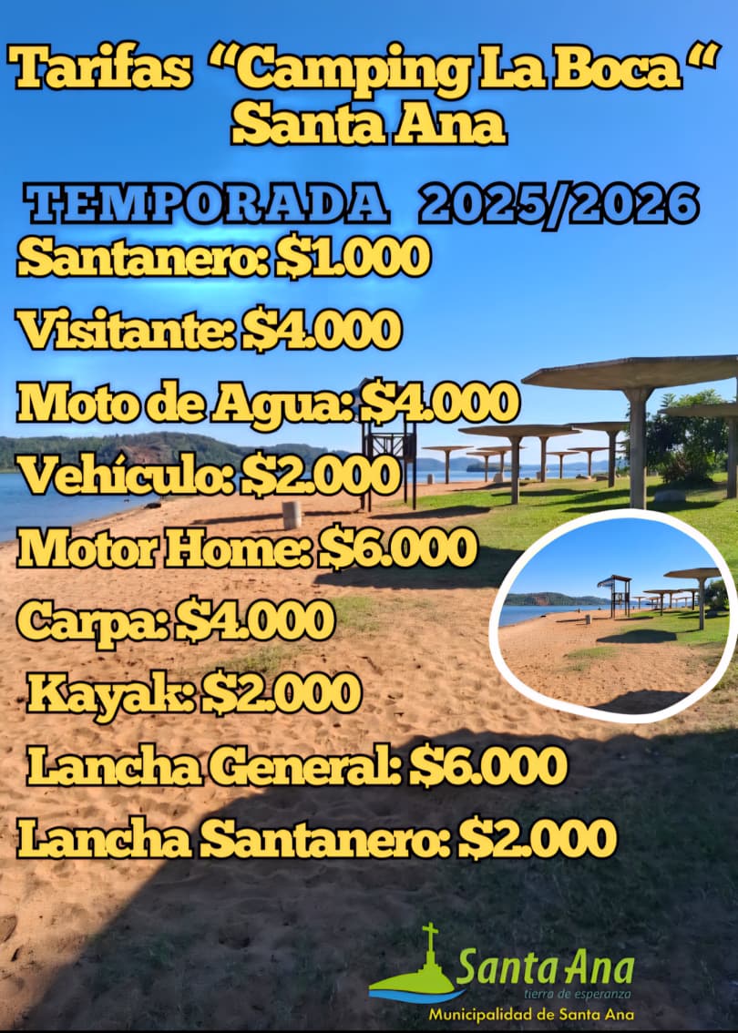 Con la recomendación de acatar las indicaciones de seguridad, la gestión municipal de Santa Ana invita a dar inicio a la temporada de verano 2026, el sábado 20 de diciembre desde las 16,00 hs con espectáculos musicales de artistas santaneros, feria de emprendedores y mucha diversión.