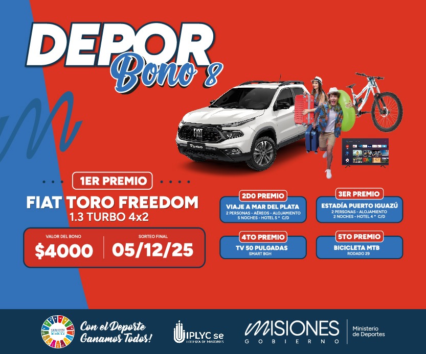 El Deporbono 8, el bono que llega y beneficia a entidades deportivas de la provincia, se sorteará este viernes a las 11 en la sala de juegos del Instituto Provincial de Lotería y Casinos Sociedad del Estado (IPLyC SE), en Posadas.