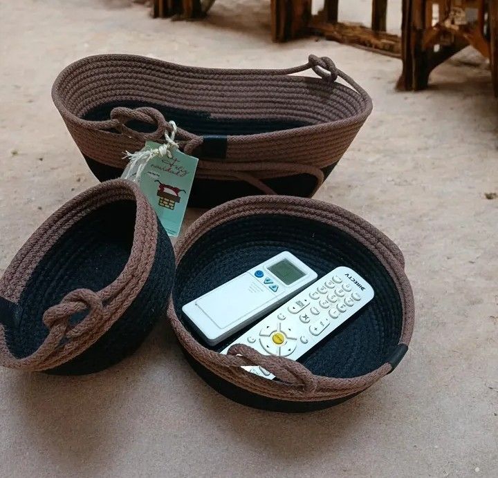 Paola trabaja desde su hogar, donde montó su pequeño taller. Allí, con su máquina de coser, une cordones gruesos de yute o algodón en forma de espiral, dando vida a piezas únicas. Entre sus creaciones se destacan paneras, carameleras, posa vasos, platos, cestitas, cuencos, individuales y porta cosméticos, entre otros.
