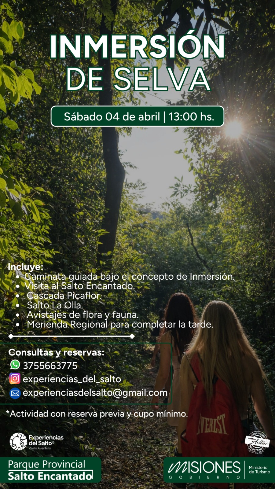 El Parque Provincial Salto Encantado será escenario de la actividad “Inmersión de Selva”, este sábado, desde las 13 h, y propone una experiencia pensada para reconectar con la naturaleza y el bienestar personal en uno de los entornos más emblemáticos de la selva misionera.