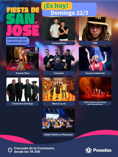 La Municipalidad de Posadas informa a la comunidad que la segunda noche de la Fiesta de San José se realizará hoy domingo 22 de marzo, en el mismo horario y con la grilla de artistas nacionales y locales prevista originalmente.