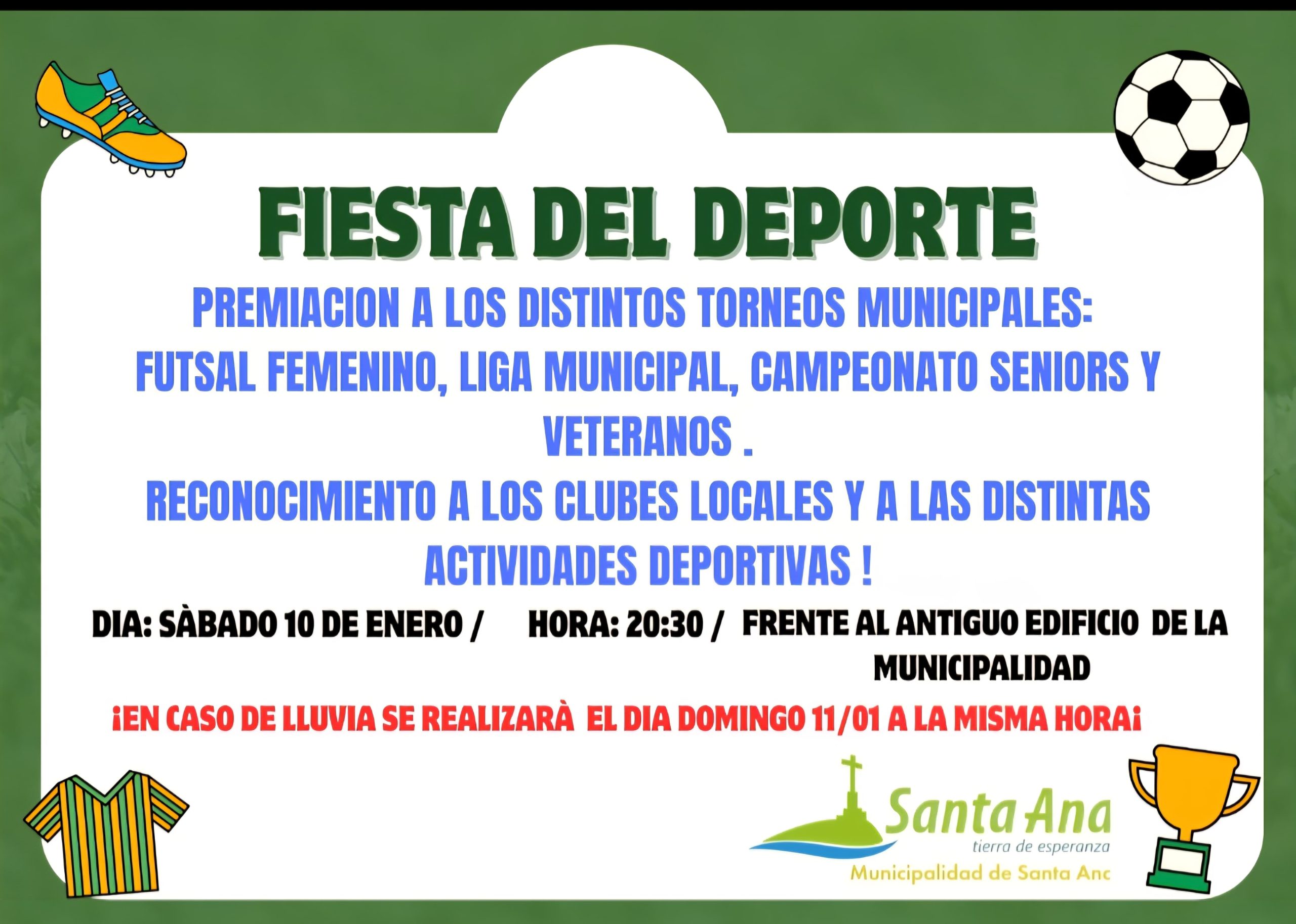 La fiesta del deporte santanero premiará a los distintos torneos municipales, Futsal femenino, liga municipal, campeonato seniors y veteranos, además de justos reconocimientos a los clubes locales y a las distintas actividades deportivas.