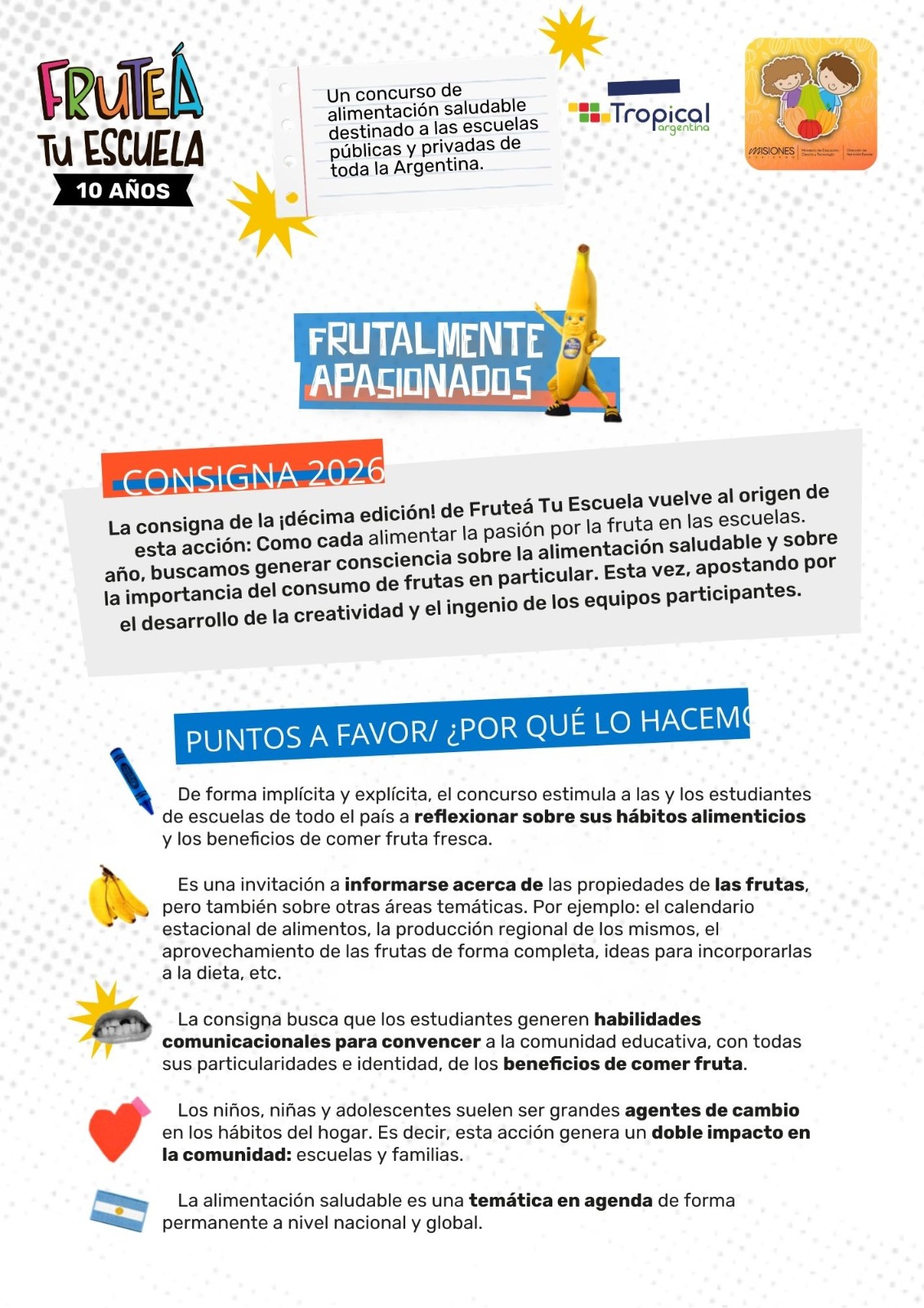 Tropical Argentina, empresa líder en el mercado de frutas, anuncia el lanzamiento de la décima edición de Fruteá Tu Escuela, su programa insignia de Responsabilidad Social Empresaria que invita a instituciones educativas públicas y privadas de todo el país a promover hábitos de alimentación saludable de forma creativa, participativa y divertida.