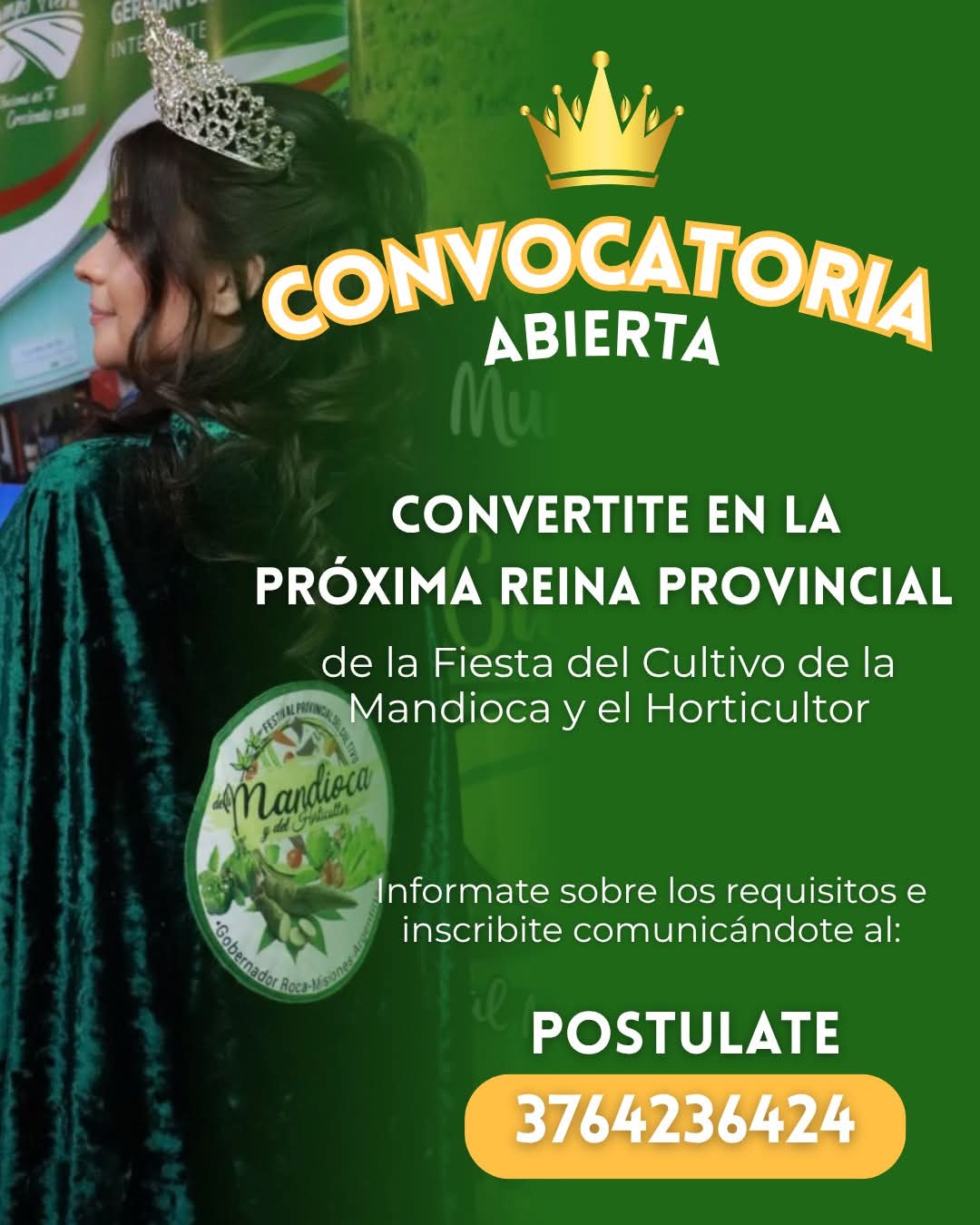 Si te gustaría ser la próxima Reina Provincial de la Fiesta del Cultivo de la Mandioca y el Horticultor, realmente esta es tu oportunidad. El municipio invita a mostrar tu carisma, compromiso y amor por las tradiciones.