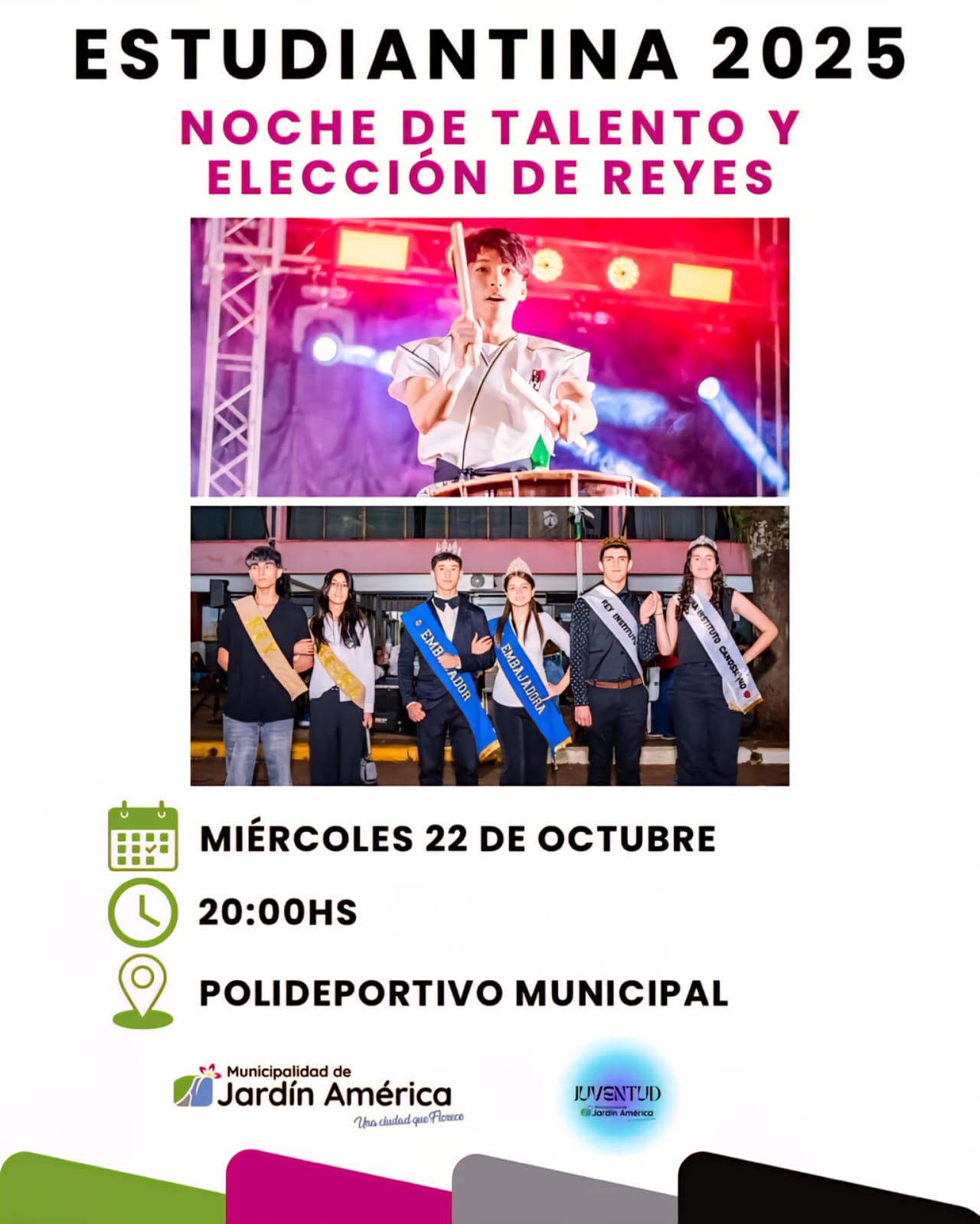 En la mitad de la semana que comienza, el miércoles 22 de octubre, a partir de las 20:00 hs, el Polideportivo Municipal será escenario de la «Noche de Talento y Elección de Reyes».
