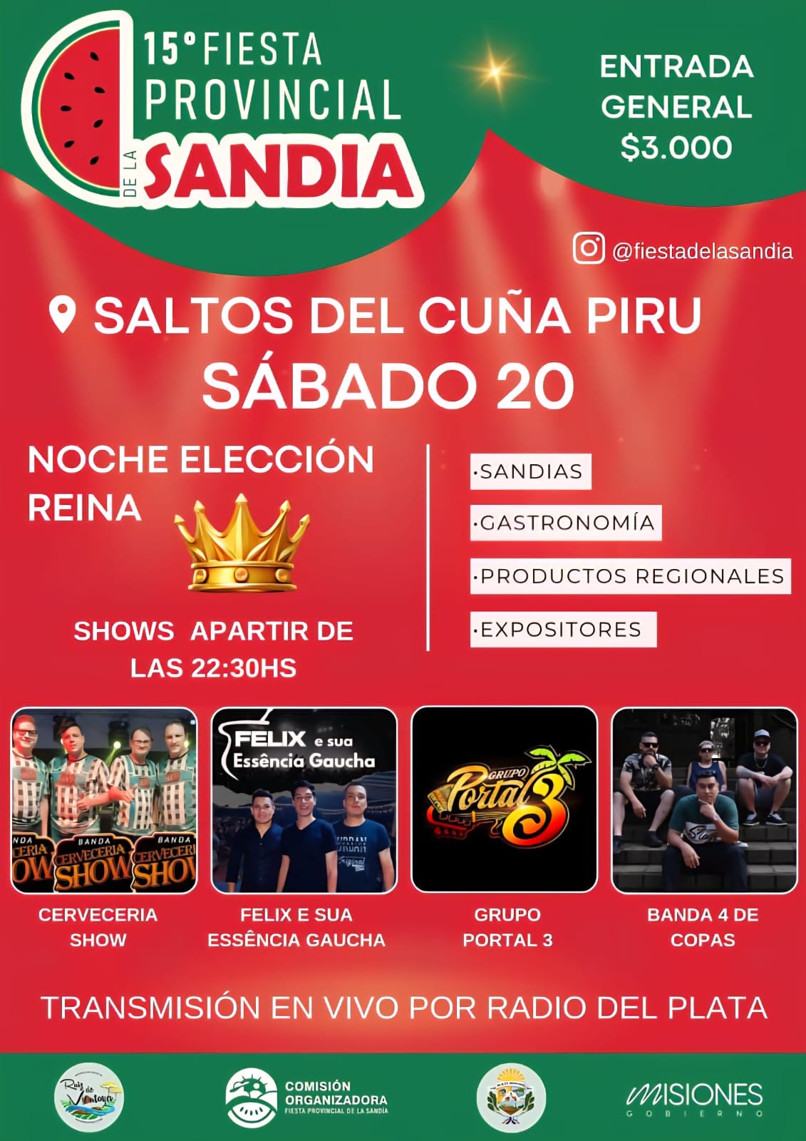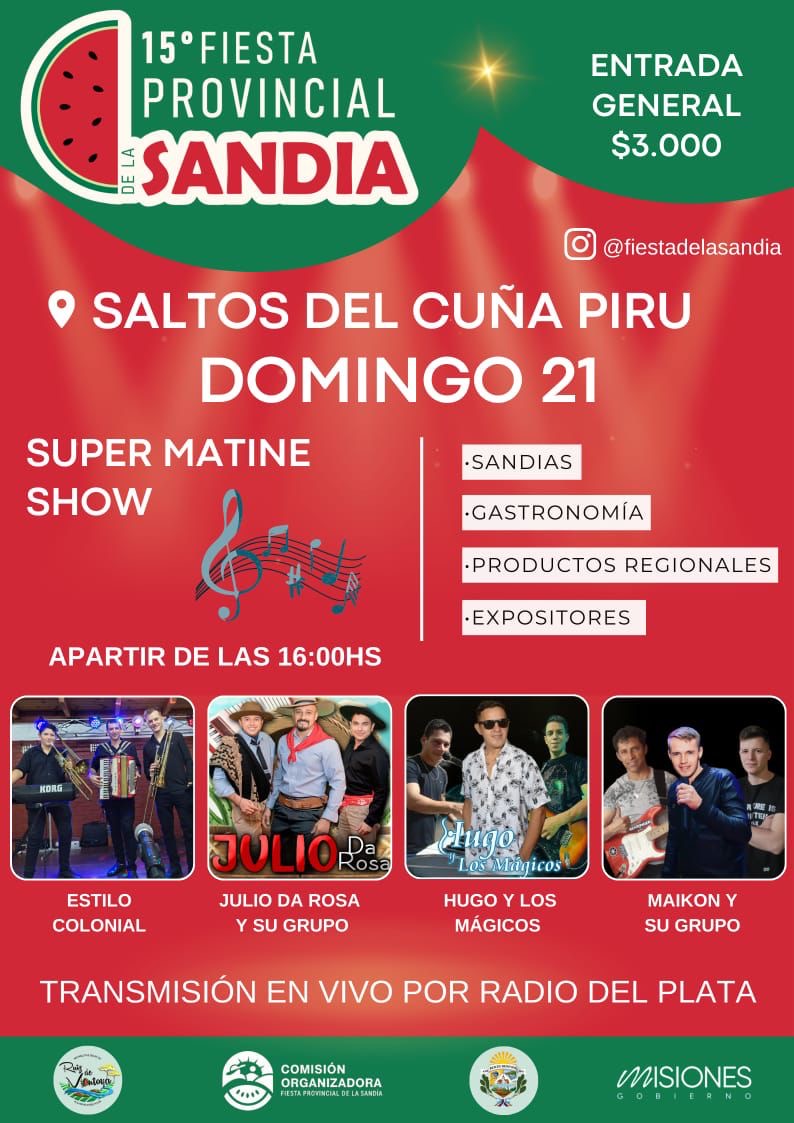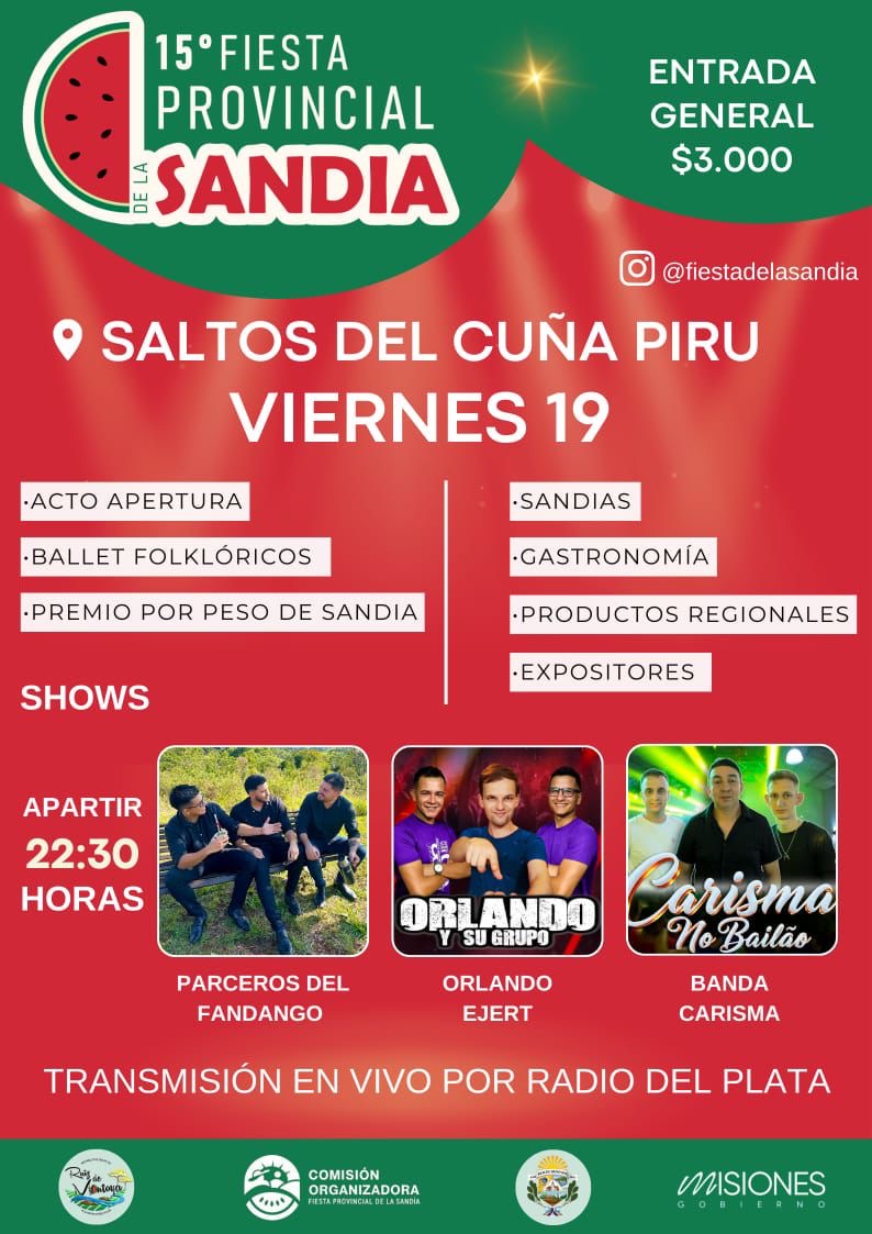 Con un nuevo escenario y un entorno natural magnífico, sumado a una cartelera impresionante de espectáculas, comienza a las 20:00 hs del día de la fecha, la Edición 2025 de la Fiesta Provincial de la Sandía en el camping, balneario salto del Cuña Pirú en Ruiz de Montoya.