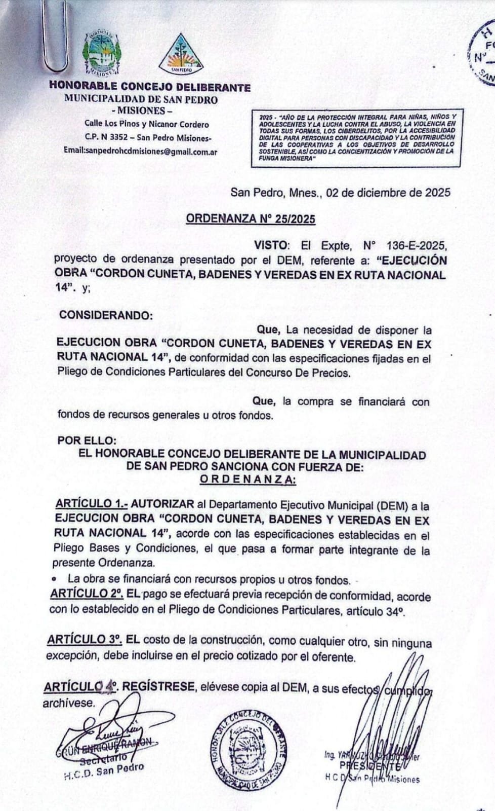 La Ordenanza N° 25/2025: qué establece, Según el documento oficial, el Concejo Deliberante autoriza al Departamento Ejecutivo Municipal a ejecutar la obra “Cordón cuneta, badenes y veredas en Ex Ruta Nacional 14”, con financiamiento proveniente de recursos propios o fondos específicos.