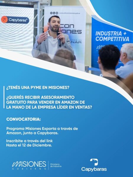 El Ministerio de Industria lanzó la convocatoria del programa “Misiones Exporta a través de Amazon”, que ofrecerá asesoramiento gratuito y especializado de la mano de Capybaras a PYMES misioneras que deseen iniciar o fortalecer su presencia en el mercado internacional. Las empresas podrán inscribirse hasta el 12 de diciembre.