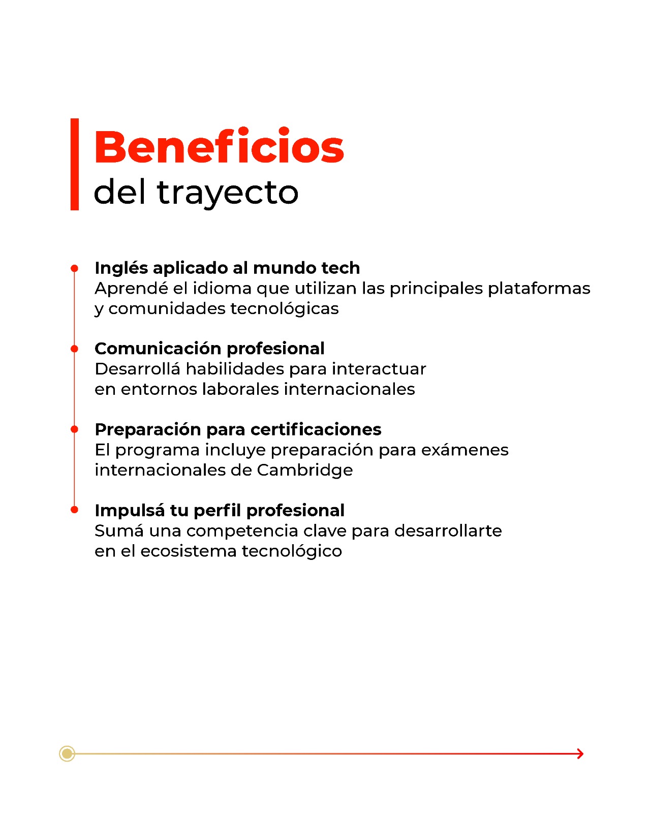 Los participantes aprenderán el idioma que utilizan las principales plataformas y comunidades del sector tech, fortaleciendo su comunicación profesional en entornos laborales internacionales.