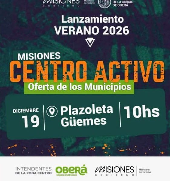 El próximo viernes 19 de diciembre a las 10:00 hs en la plaza Güemes, del centro de la ciudad de Oberá, se llevará adelante el lanzamiento de la temporada verano 25 -26, » Misiones, Centro Activo», que abarca la zona centro de la provincia de Misiones.