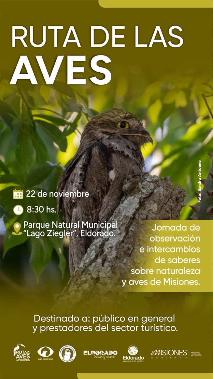 Este sábado 22 de noviembre, a partir de las 8:30 h, se realizará una jornada de observación e intercambio de saberes sobre la naturaleza y las aves de Misiones en el Parque Natural Municipal Laguna Ziegler, Eldorado.