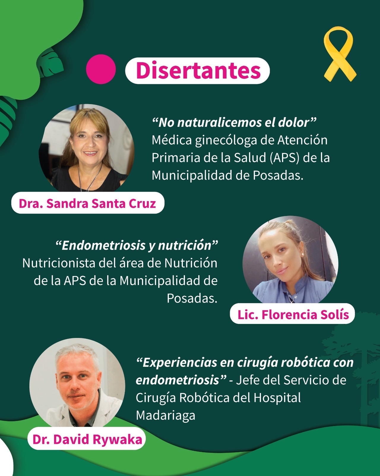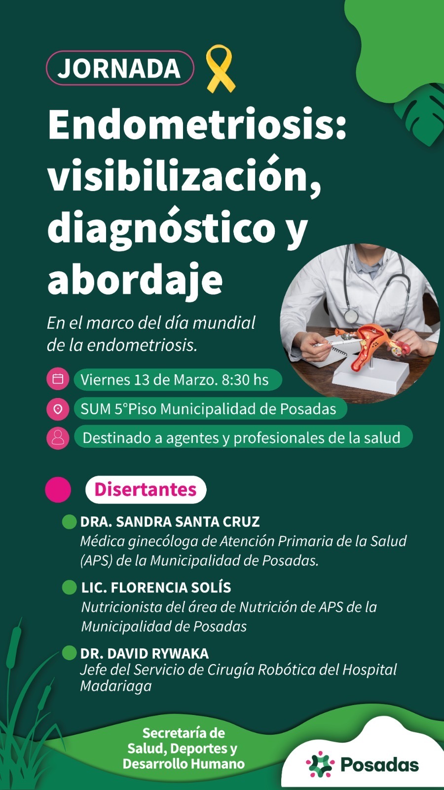 Durante la jornada participarán como disertantes la Dra. Sandra Santa Cruz, médica ginecóloga de Atención Primaria de la Salud (APS) de la Municipalidad de Posadas, quien abordará la temática “No naturalicemos el dolor”; la Lic. Florencia Solís, nutricionista del área de Nutrición de APS, con la exposición “Endometriosis y nutrición”; y el Dr. David Rywaka, jefe del Servicio de Cirugía Robótica del Hospital Madariaga, quien compartirá su experiencia en la charla “Experiencias en cirugía robótica con endometriosis”.