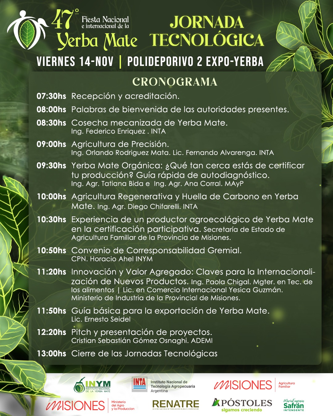 “Estamos trabajando con la Mesa Interinstitucional en la segunda parte de las Jornadas Tecnológicas, que en este caso será áulica, porque la parte práctica ya se realizó en septiembre. El encuentro teórico se desarrollará el viernes 14 de noviembre, de 7:30 a 12 horas, en el Polideportivo II, donde se abordarán temas solicitados por los propios integrantes de la familia yerbatera. A partir de las inquietudes de productores e industriales se elaboró el temario de esta nueva edición”, explicó Poterala.