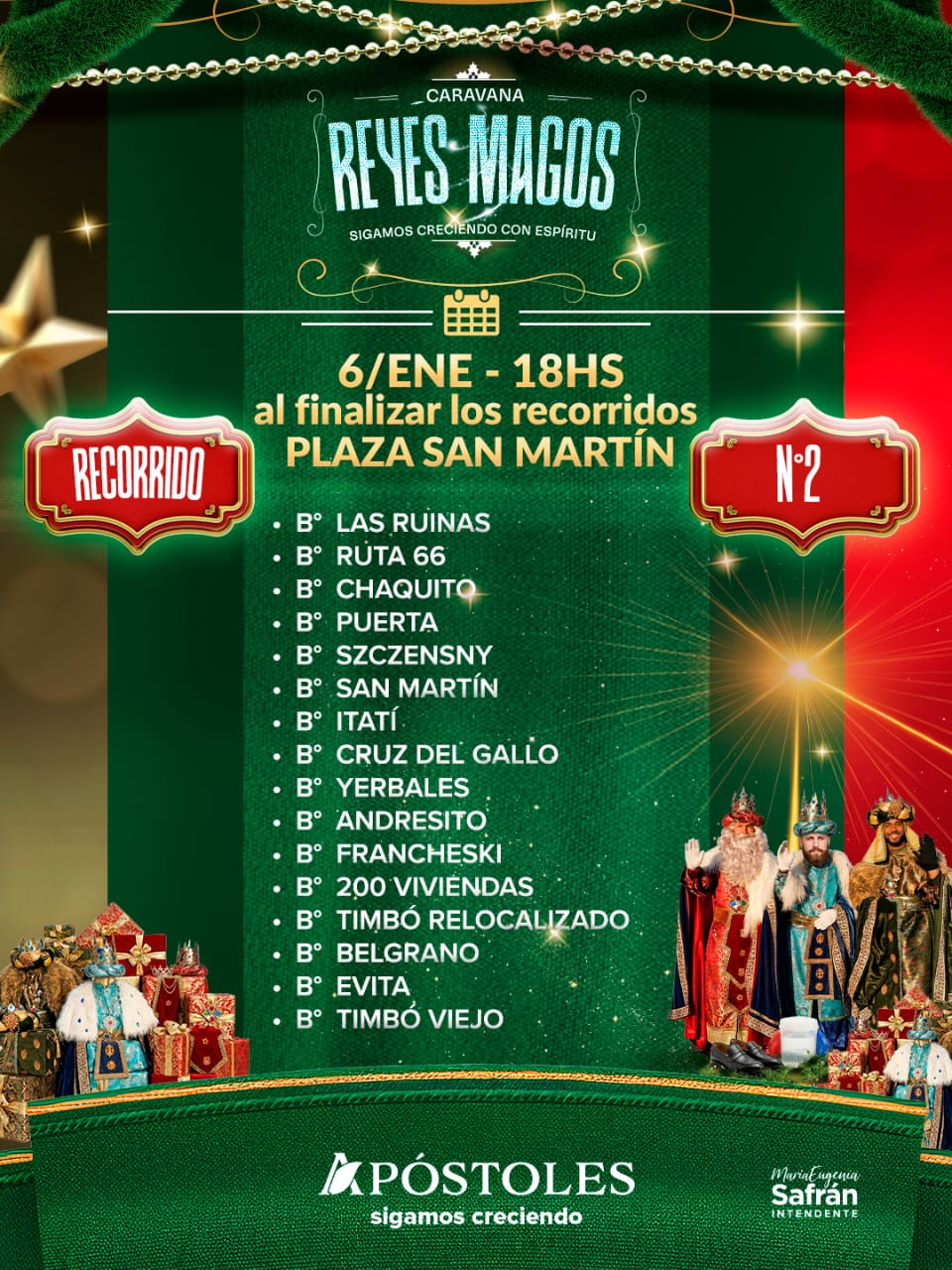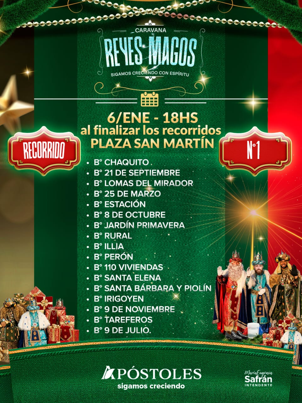 La Municipalidad de Apóstoles, a través de la Dirección de Cultura, anunció la realización de una nueva edición de la tradicional Caravana de los Reyes Magos, que se llevará a cabo el martes 6 de enero a partir de las 18:00 horas, recorriendo los distintos barrios de la ciudad.