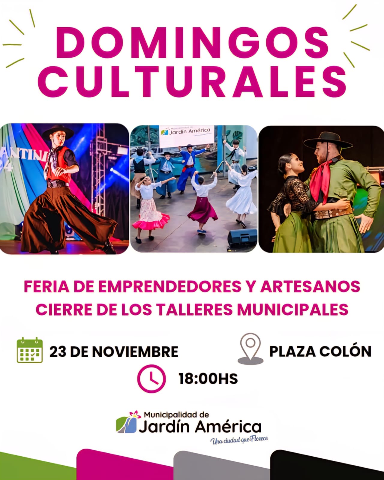 Hoy domingo 23 de noviembre, desde las 18 hs, Jardín América te espera en la Plaza Colón para compartir una tarde llena de arte, música y encuentros.