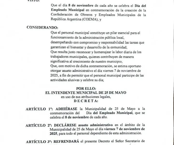 La Municipalidad de 25 de Mayo declaró Asueto Administrativo para el día viernes 7 de noviembre en el ámbito municipal