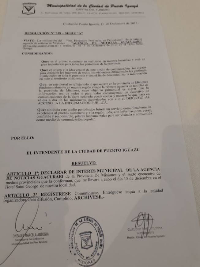 Declaración de Interés de la Municipalidad de Puerto Iguazú para la Agencia de Noticias Guacurarí