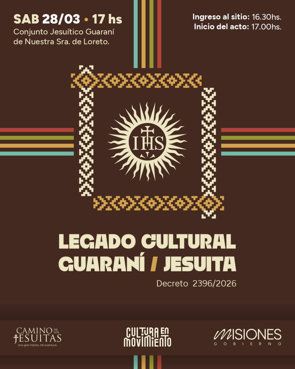El Gobierno de la Provincia de Misiones, a través de la Secretaría de Cultura, tiene el agrado de invitar a la presentación del Decreto N.º 2396, por el cual se declara al año 2026 como el “Año del legado cultural guaraní jesuítico”.