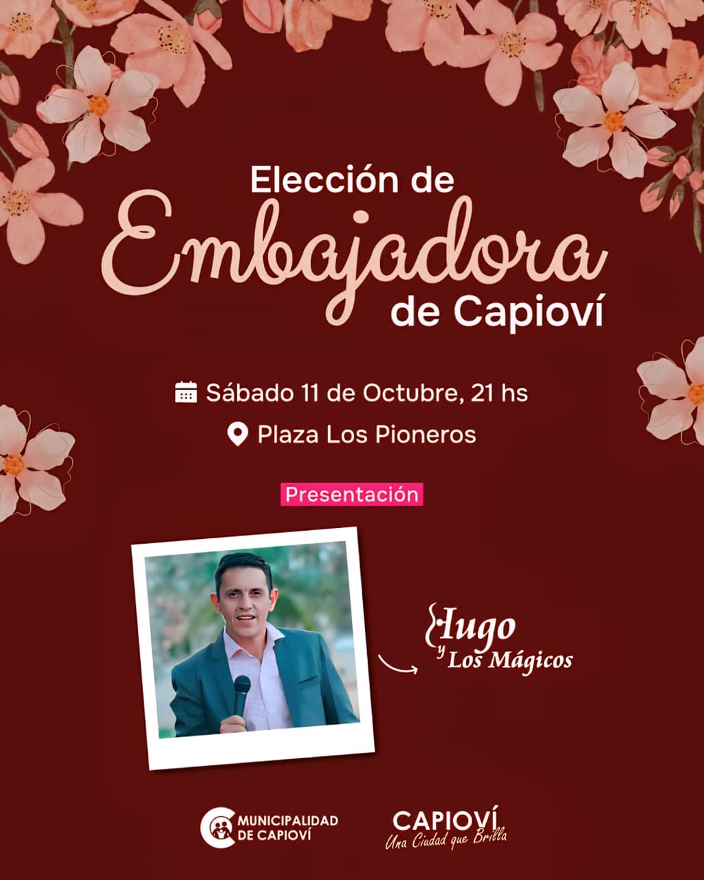 Será una noche donde las emociones estarán a flor de piel, ya que el pueblo se congregará en la tradicional plaza «Los Pioneros» con su escenario “Padre José Marx”, para la fiesta elección de la nueva embajadora de Capioví que llevará los atributos durante el período 25- 26 y se encargará de difundir, en todo el país, los atractivos que ofrece el municipio.