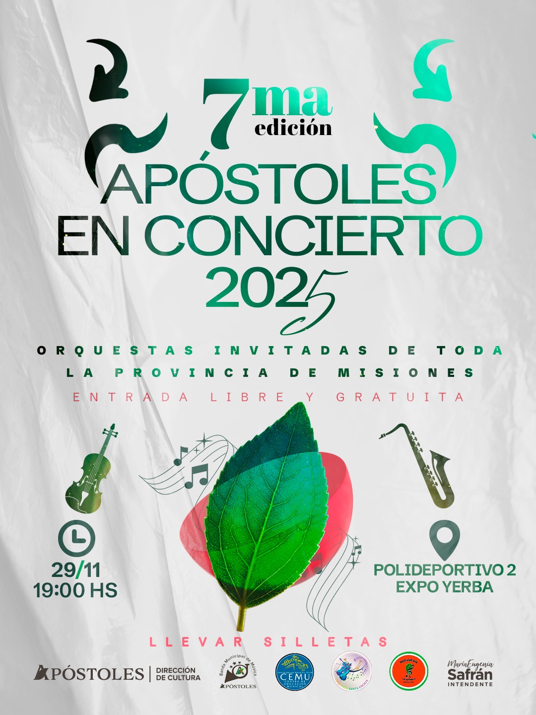 El sábado 29 de noviembre, en el Polideportivo 2 de la Expo Yerba, Apóstoles será sede del Encuentro de Bandas y Orquestas. Con ensayos, ensambles y un show abierto al público desde las 19:00, el evento reunirá a músicos de toda la provincia y el país para celebrar la música y la educación cultural.