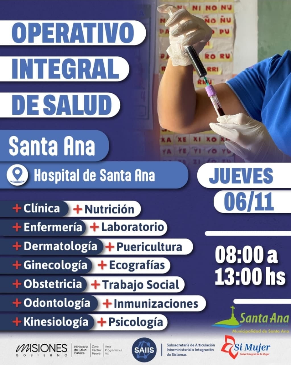 El hospital de Santa Ana será sede, el jueves 6 de noviembre, de servicios gratuitos de atención de la salud del ministerio de salud pública de Misiones, de la mano de la subsecretaría de articulación interministerial e integración de sistemas, junto al programa “SI Mujer”.