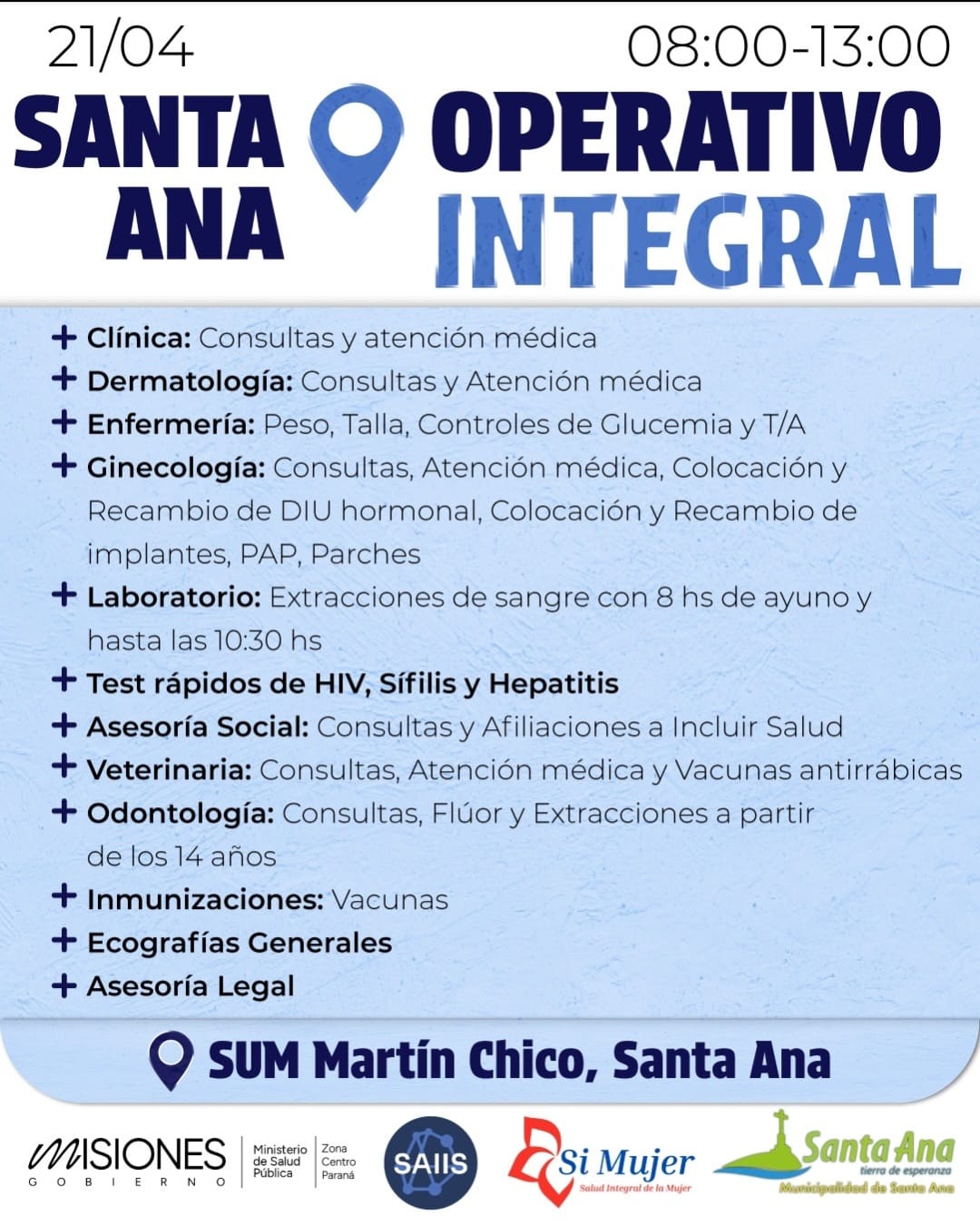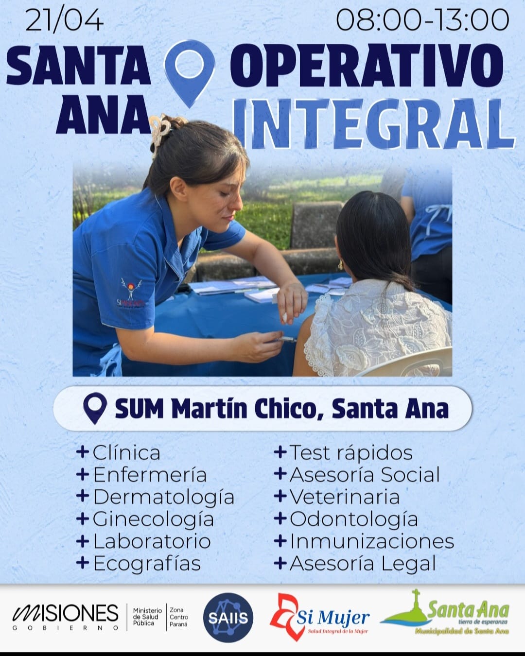 De la mano de la gestión de Mabel Pezoa al frente del municipio de Santa Ana, articulando con el ministerio de salud pública de Misiones y el programa integral de cuidado «Si Mujer», se llevará adelante un operativo integral de salud el próximo martes 21 de abril de 8 a 13 hs, en el SUM “Martín Chico”, de la localidad.