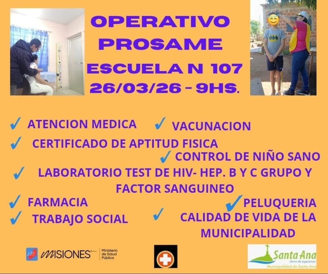 El Programa PROSAME despliega hoy un nuevo operativo sanitario en la localidad de Santa Ana, con el objetivo de realizar controles primarios y fortalecer el acceso a la salud en la población escolar. La actividad estará a cargo de equipos médicos y agentes sanitarios del Hospital de Santa Ana y del Nivel Central de Posadas.