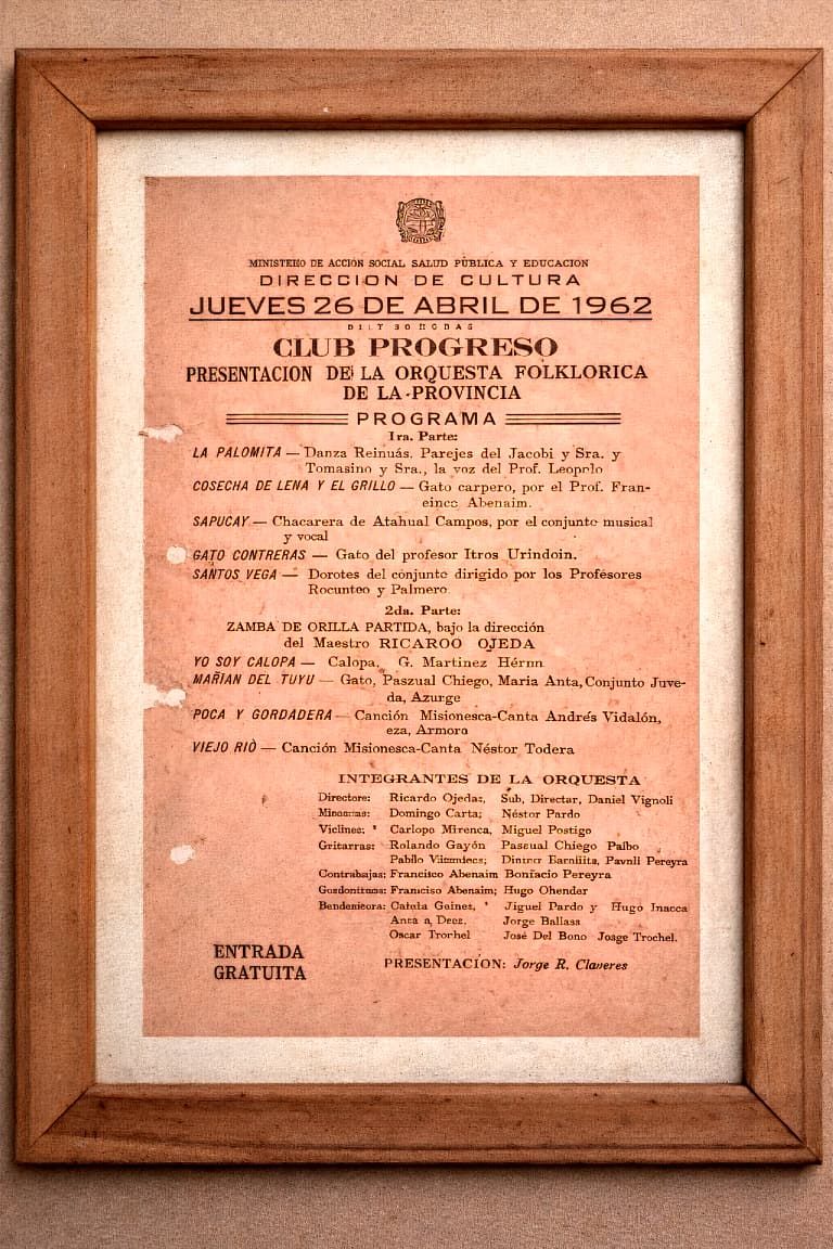 Fundada el 22 de febrero de 1962 por iniciativa de Lucas Braulio Areco, la Orquesta Folklórica de la Provincia nació con una misión clara: preservar, promover, difundir y proyectar los ritmos que definen la alma misionera.